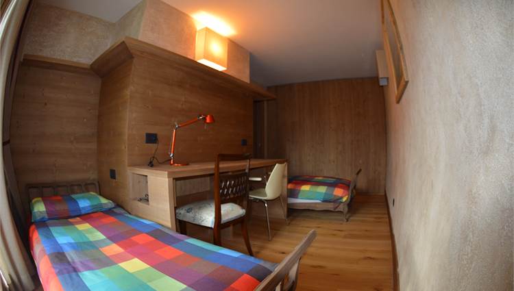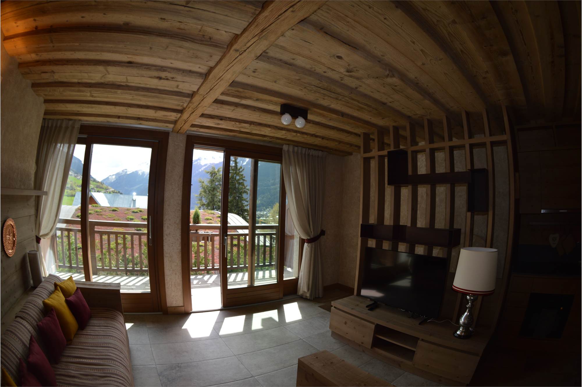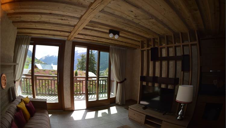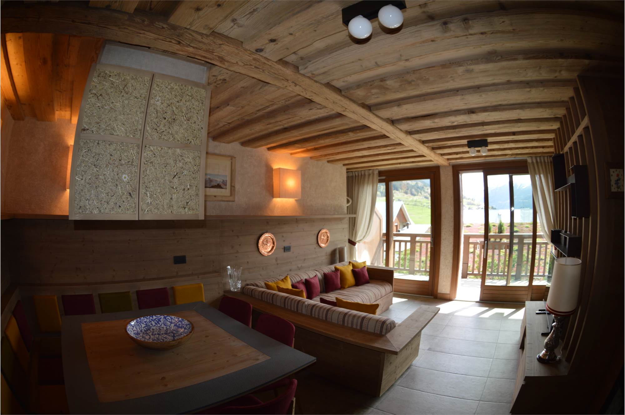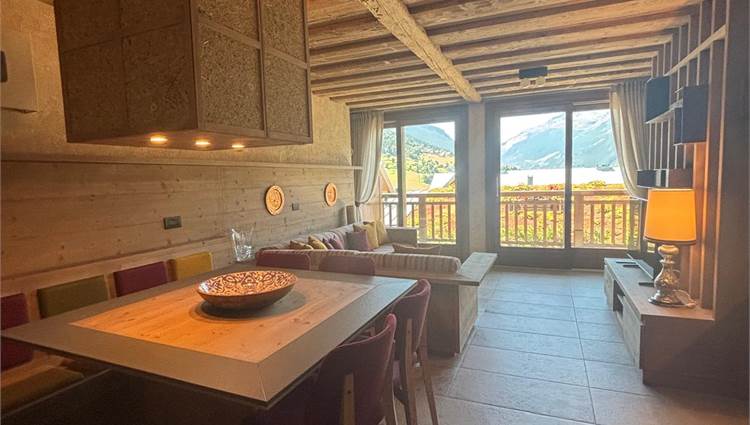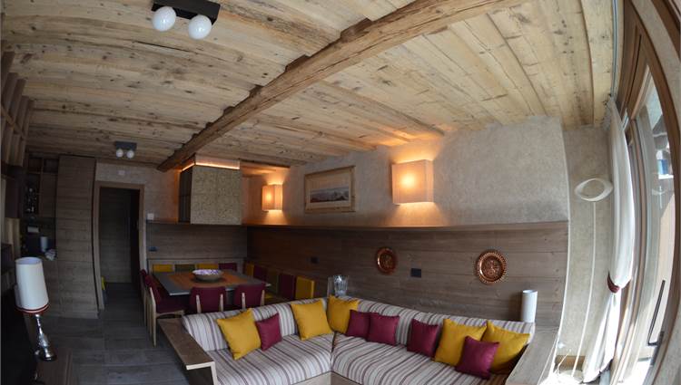 Il piano giorno è composto da soggiorno interamente pannellato in legno antico pregiato, cucina a vista completa di elettrodomestici Miele, bagno con doccia e ampio terrazzo esposto a sud con splendida vista sulla valle di Bormio e sulla pista Stelvio.