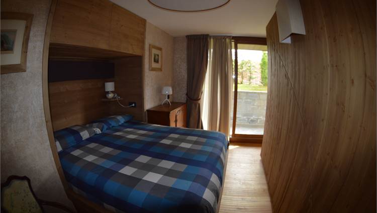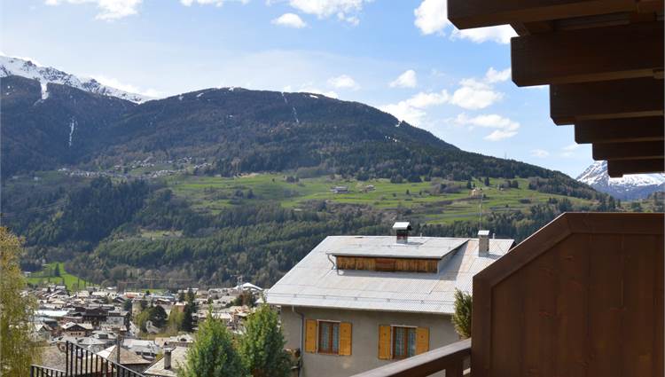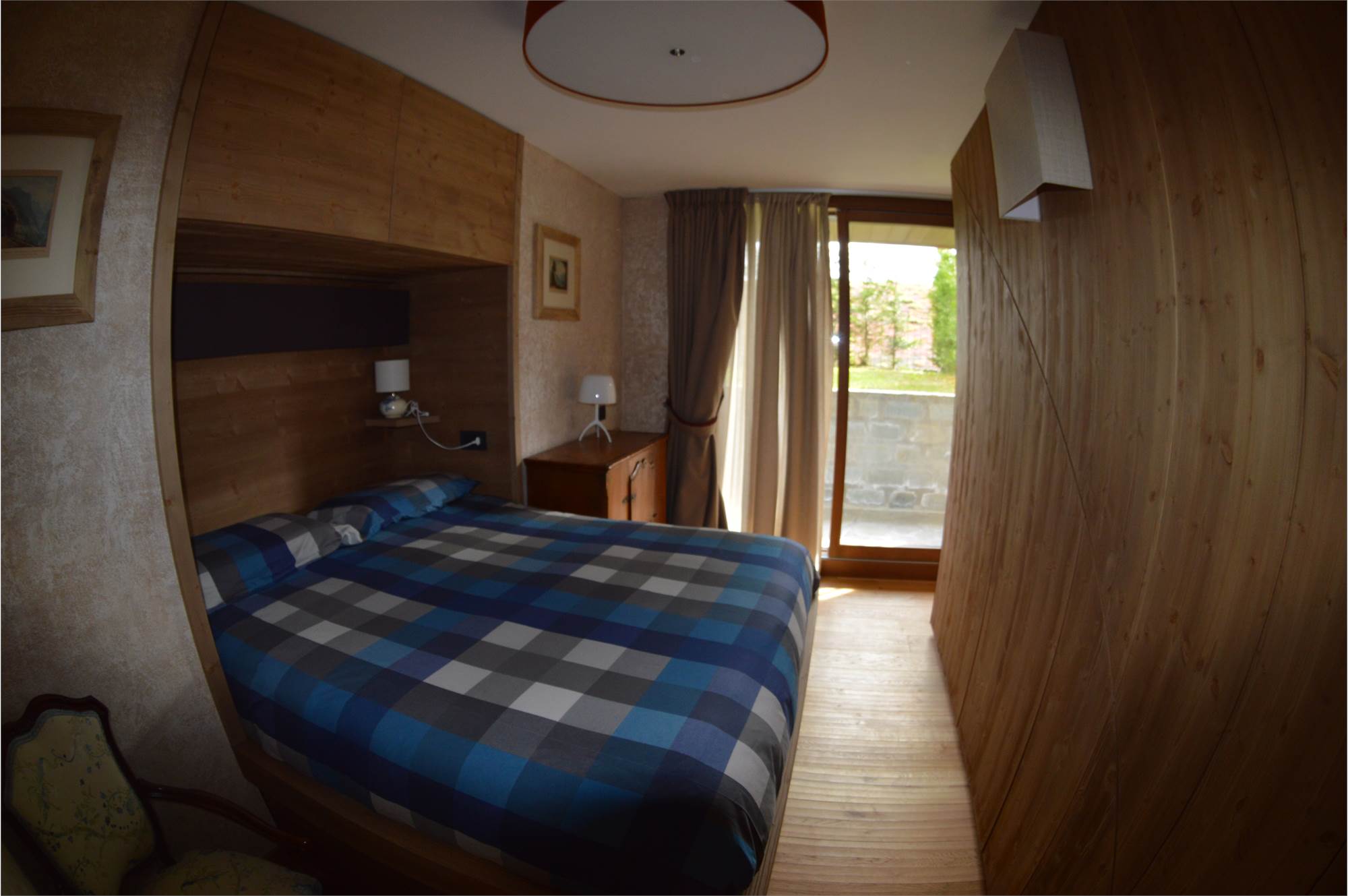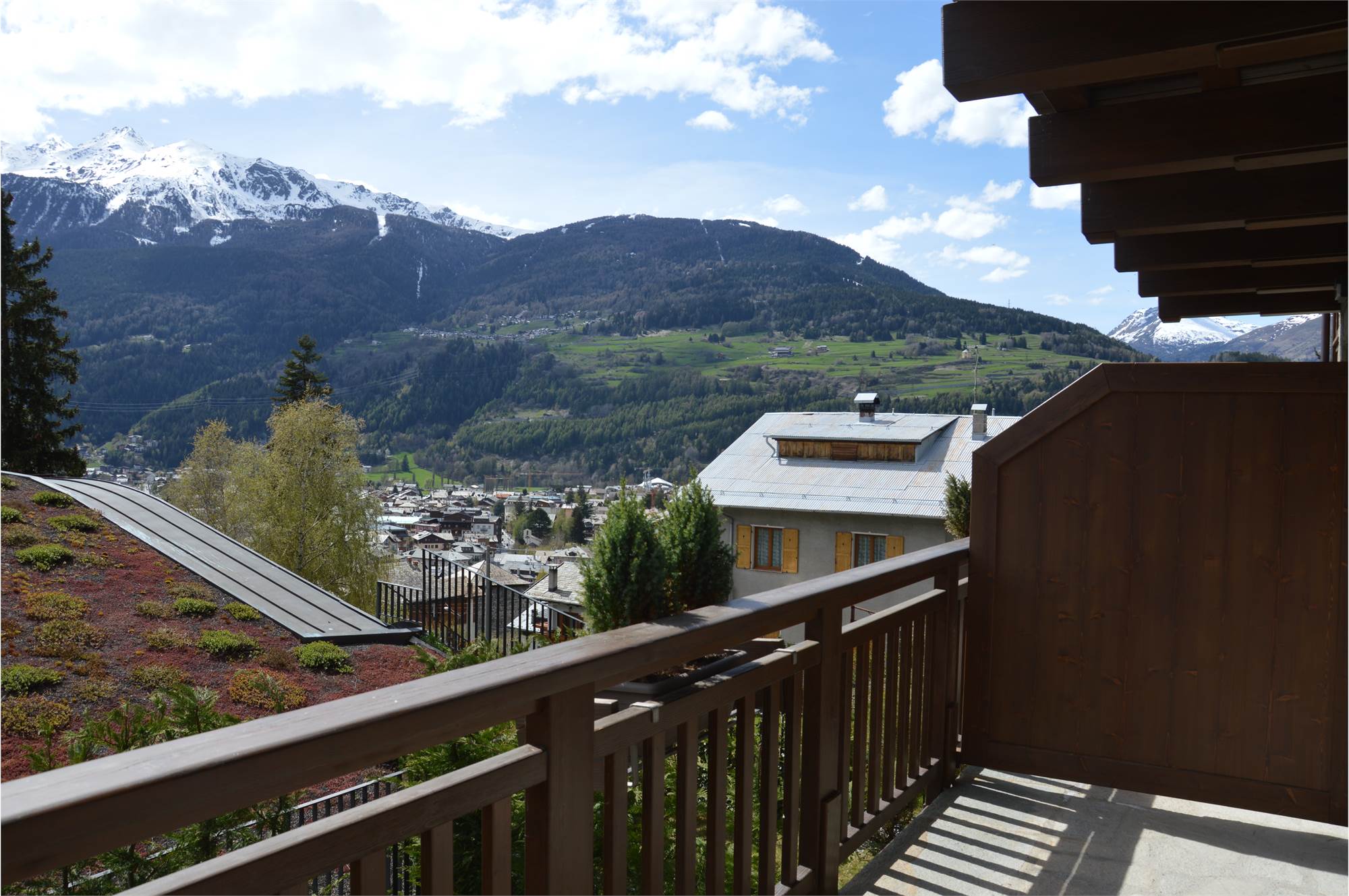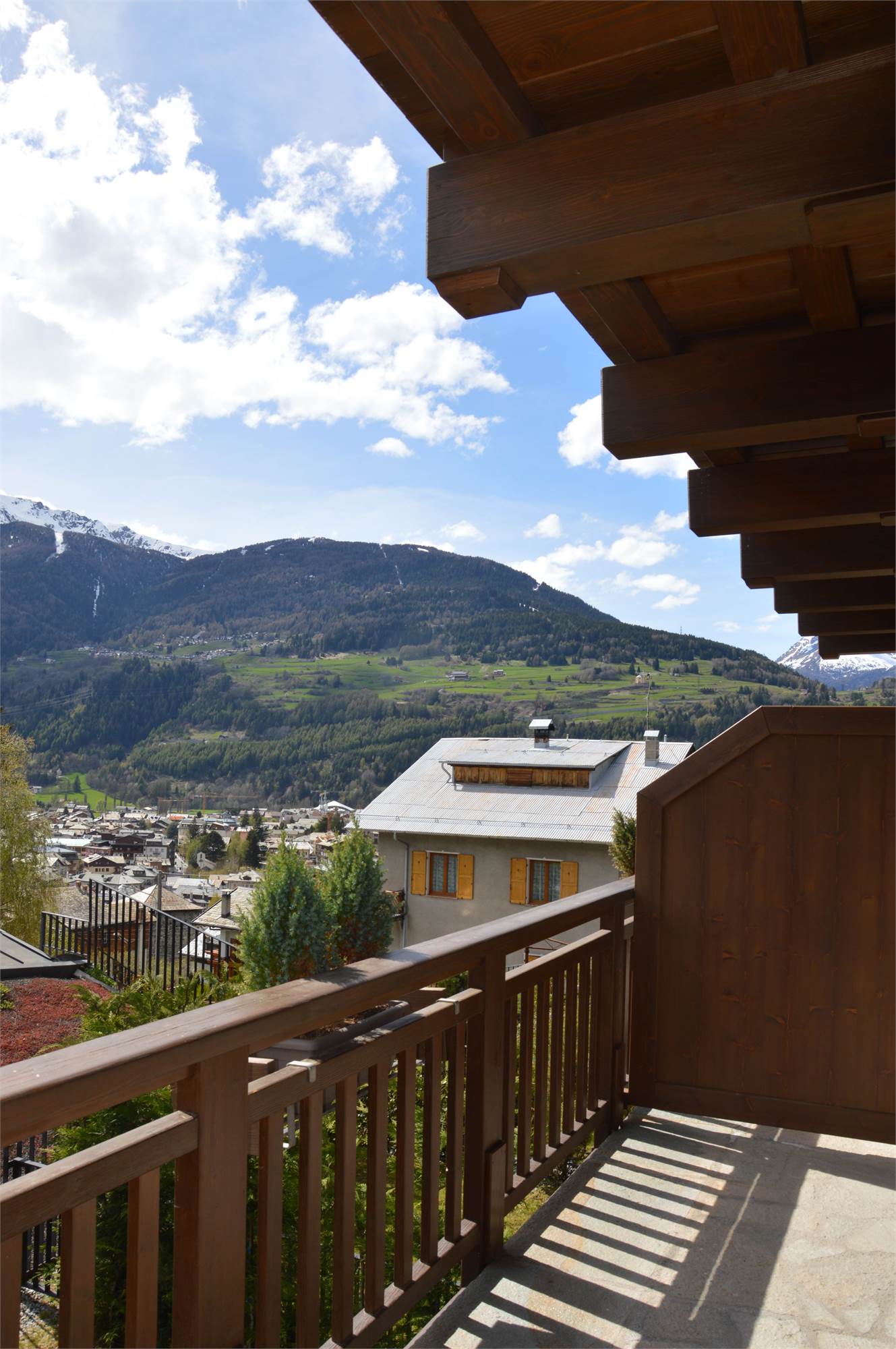Il piano giorno è composto da soggiorno interamente pannellato in legno antico pregiato, cucina a vista completa di elettrodomestici Miele, bagno con doccia e ampio terrazzo esposto a sud con splendida vista sulla valle di Bormio e sulla pista Stelvio.